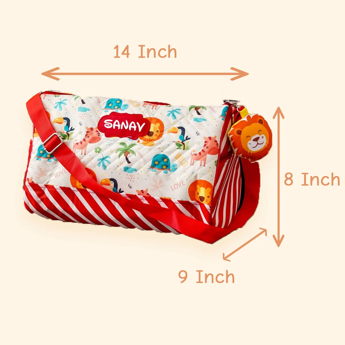 A premium personalised duffle bag designed for travel, sports, and activity classes. Features 2 side zipper pockets, printed inner lining, adjustable sling belt, and a matching toy keychain — making it both stylish and practical.