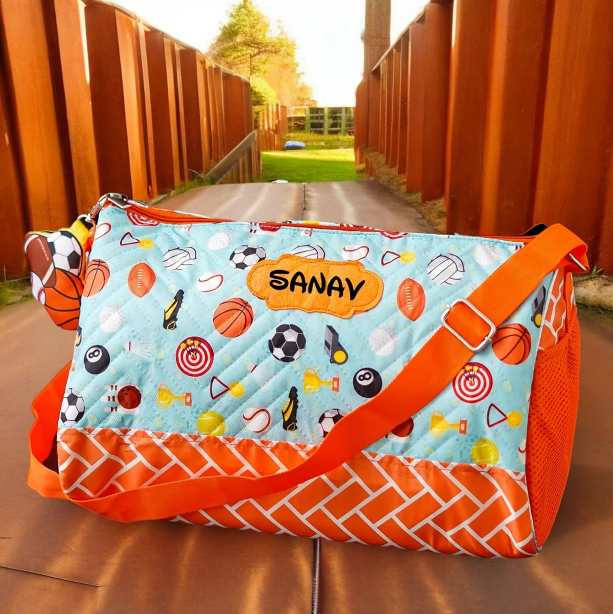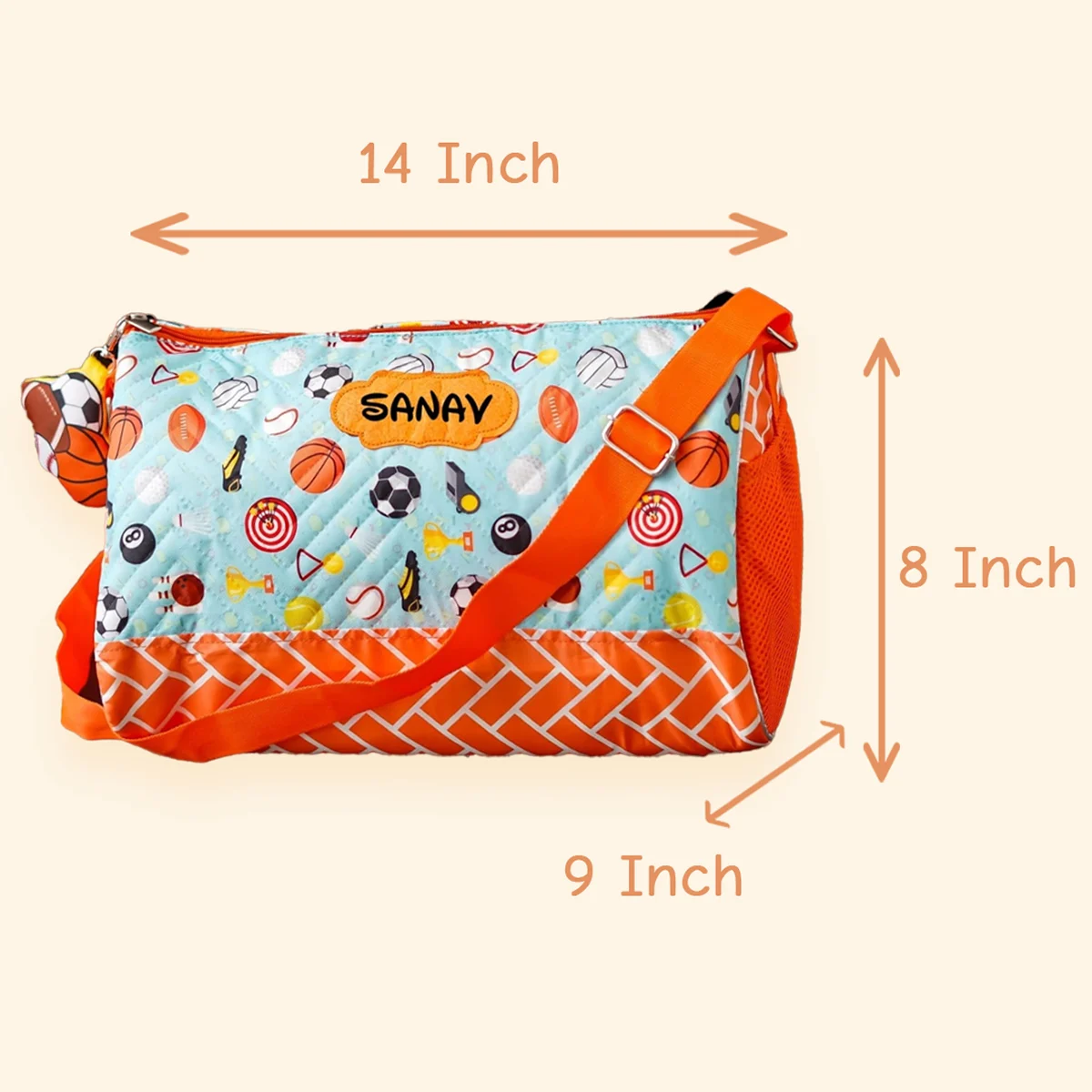 A premium personalised duffle bag designed for travel, sports, and activity classes. Features 2 side zipper pockets, printed inner lining, adjustable sling belt, and a matching toy keychain — making it both stylish and practical.