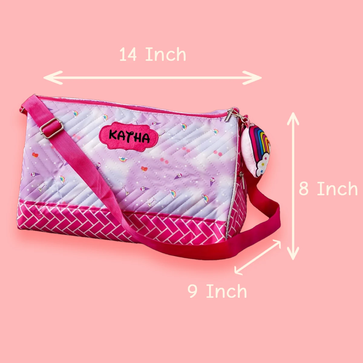 A premium personalised duffle bag designed for travel, sports, and activity classes. Features 2 side zipper pockets, printed inner lining, adjustable sling belt, and a matching toy keychain — making it both stylish and practical.