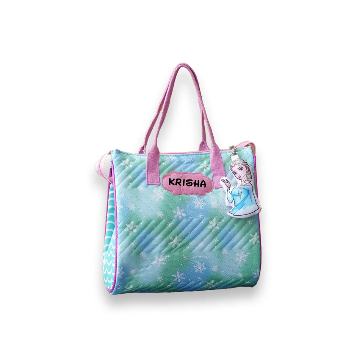 A stylish and practical personalised tote bag designed with a customised name patch, secure centre zip closure, and 3 inner pockets for organised storage. Comes with a cute toy keychain and works perfectly as a mommy-baby bag, tuition bag, picnic tote, or gifting option.