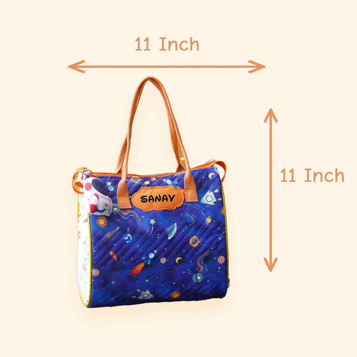 A stylish and practical personalised tote bag designed with a customised name patch, secure centre zip closure, and 3 inner pockets for organised storage. Comes with a cute toy keychain and works perfectly as a mommy-baby bag, tuition bag, picnic tote, or gifting option.